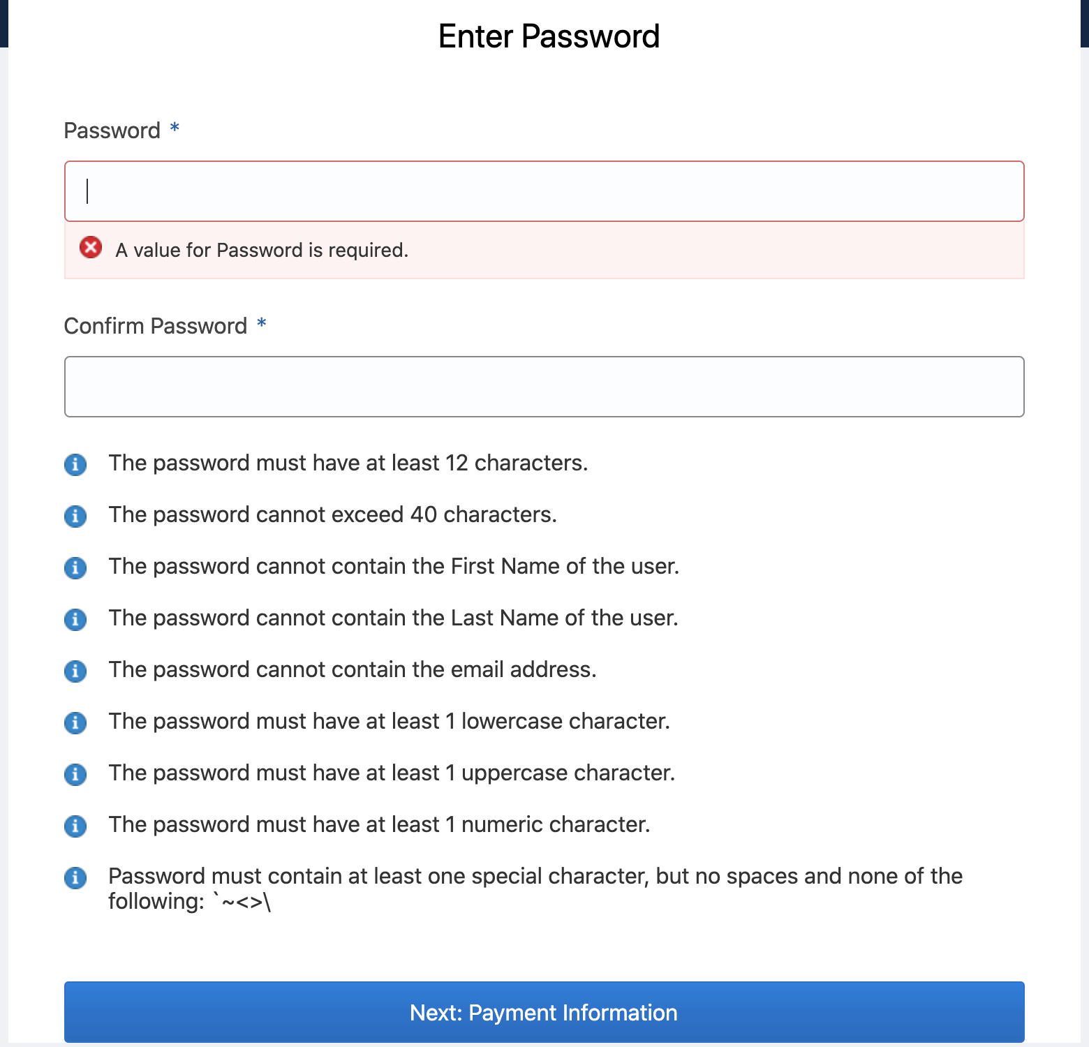 14. 비밀번호를 입력하고 Next버튼을 클릭합니다. 비밀번호가 좀 까다롭습니다. 12자 이상이여야 하고 영문소문자/영문대문자/숫자/특수문자가 포함되어 있어야 합니다.(메모를 해두는게 좋을 것 같습니다. 저같은 경우 이렇게 복잡하게 해놓으면 꼭 나중에 까먹더라고요.)