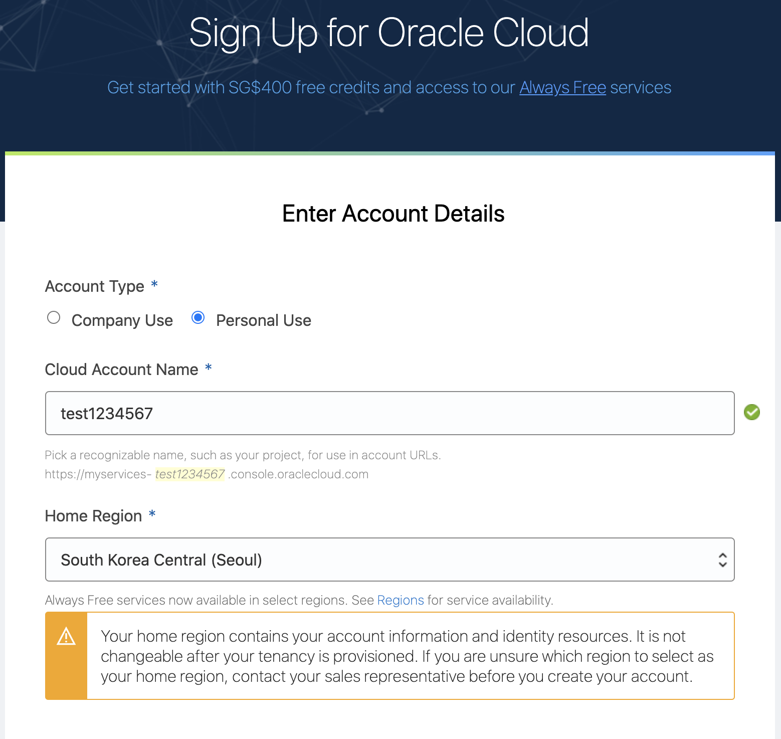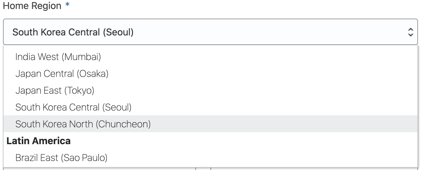 5. Home Region은 서버 위치인데 저는 서울을 선택하였습니다. 한국의 경우 서울과 춘천 2개가 있습니다.