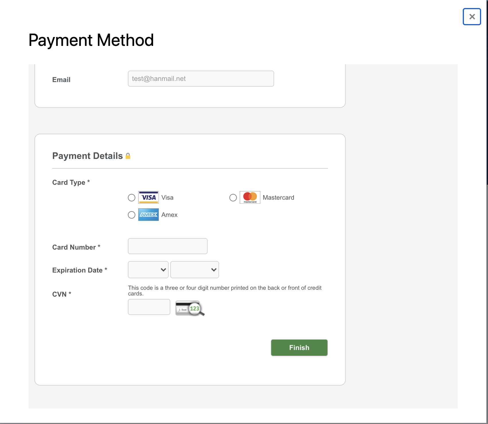 17. 카드타입/카드번호/유효기간/CVC 코드까지 모두 입력하고 Finish 버튼을 클릭하시면 회원가입이 완료 됩니다.