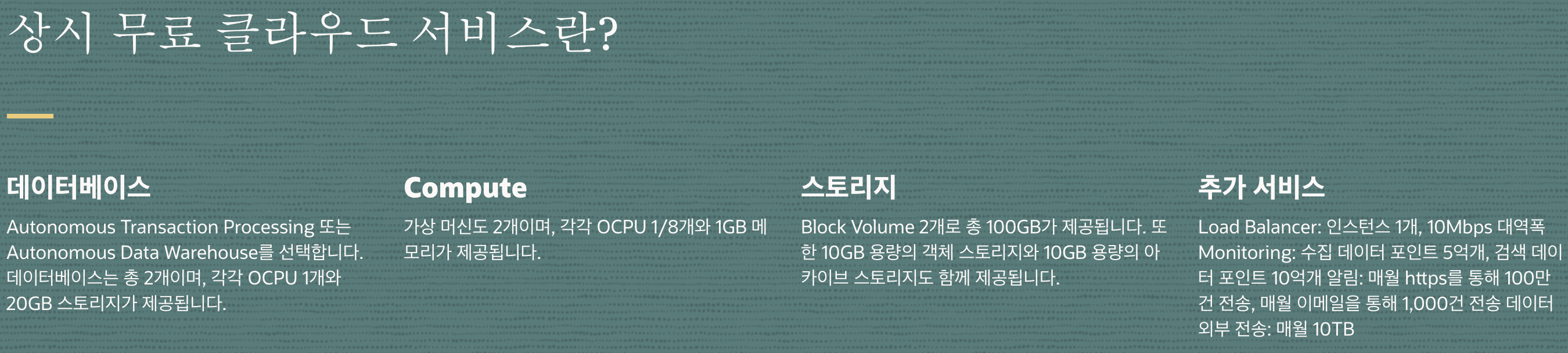 Oracle Cloud Free Tier(상시 무료 신규 서비스): 오라클에서 제공하는 평생 무료로 사용할 수 있는 클라우드 서버 입니다.