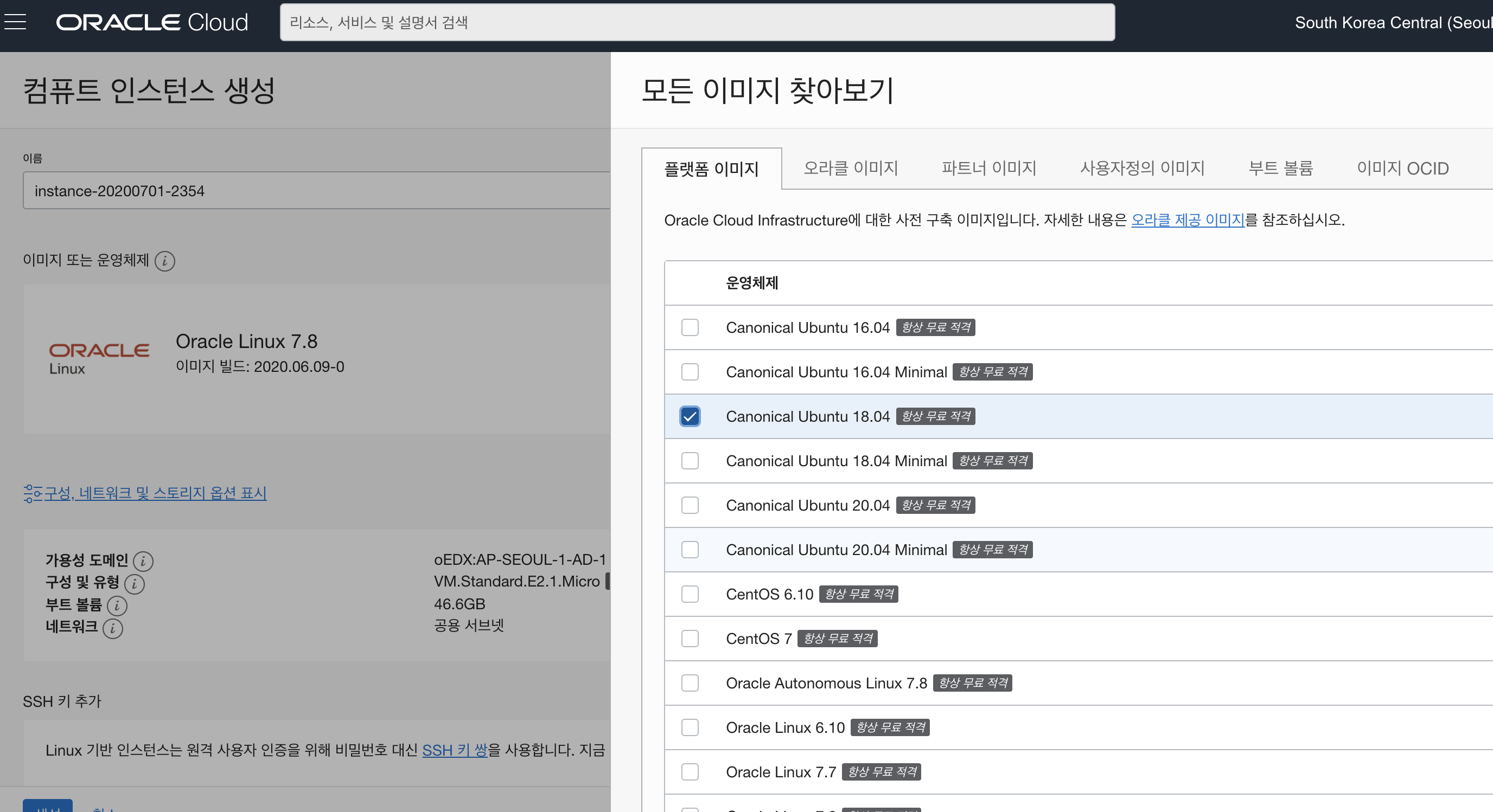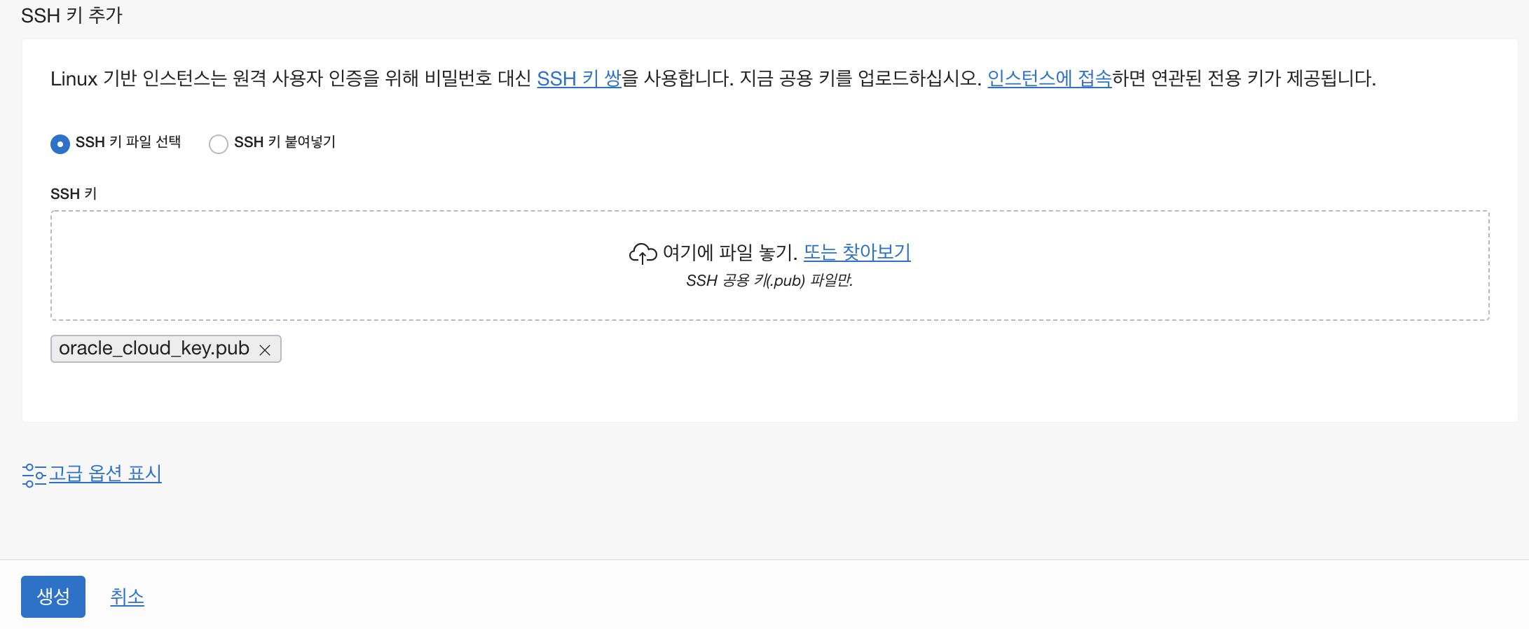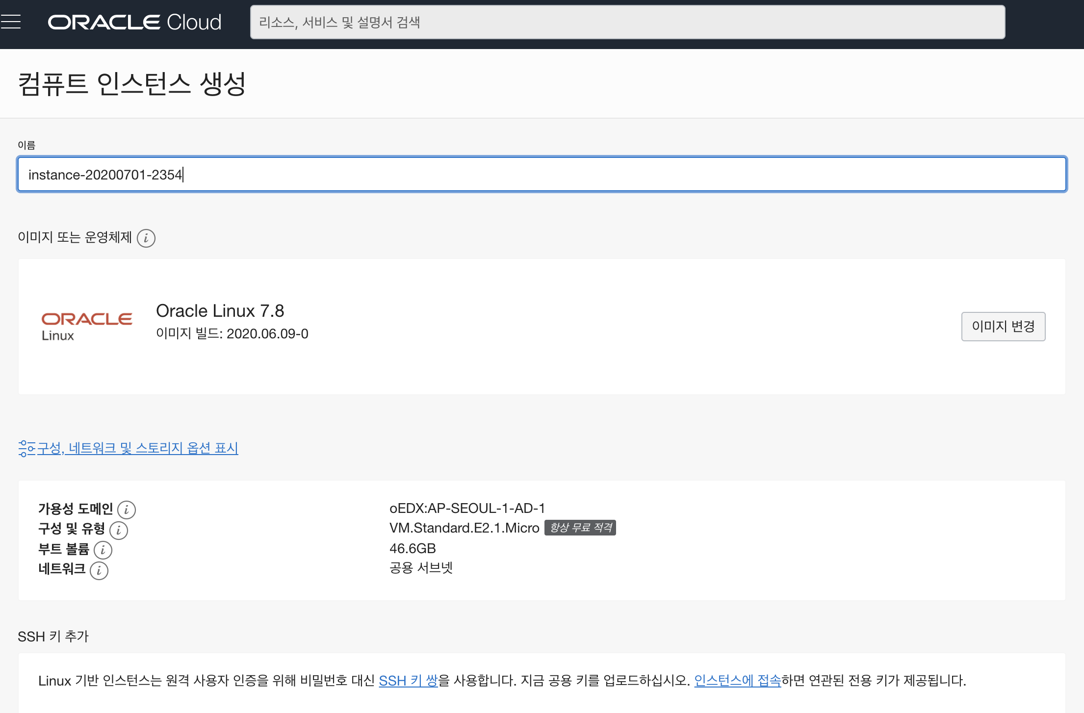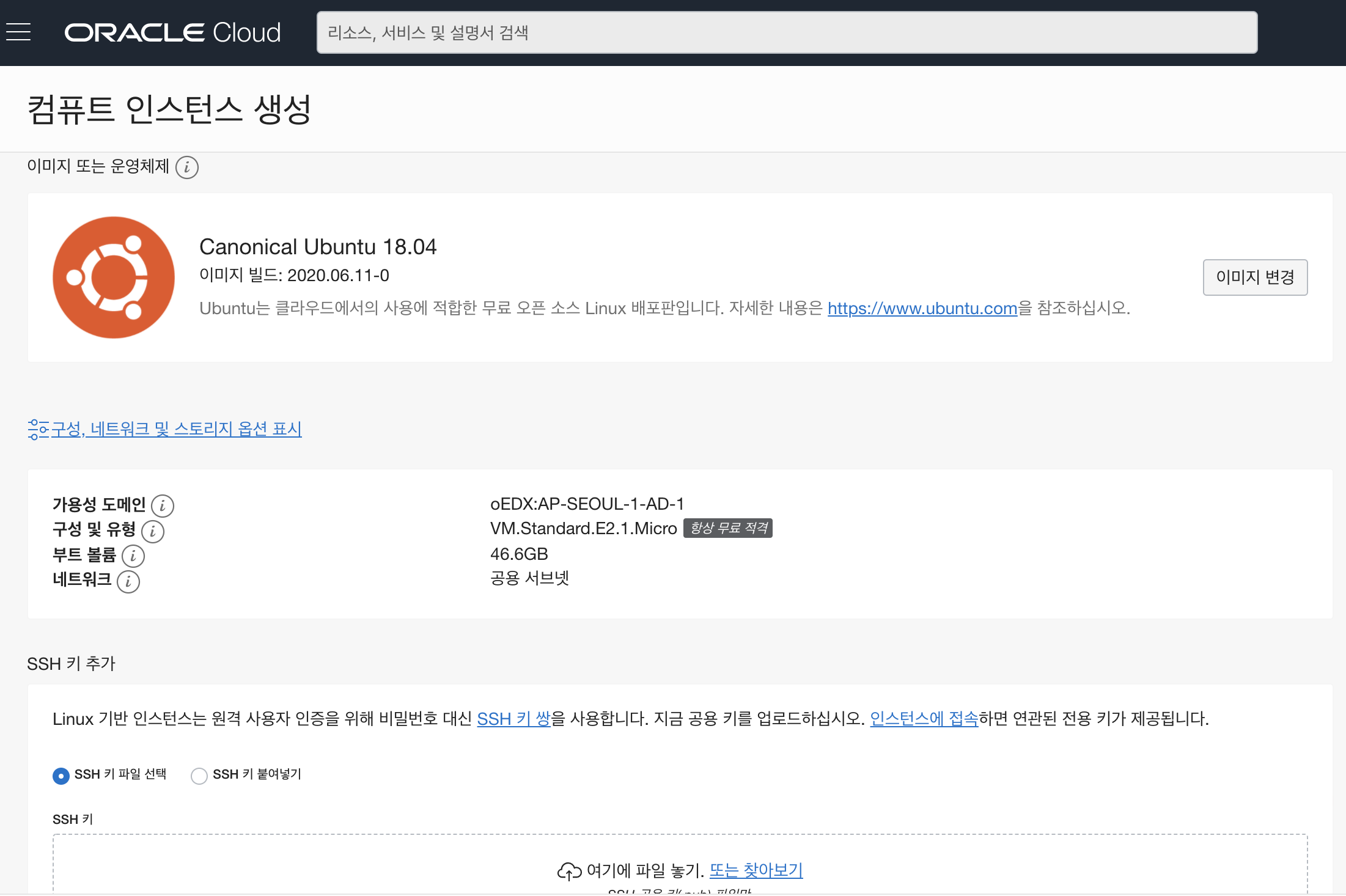 5. SSH 키 추가를 하여야 합니다. AWS의 경우 키를 제공하여 주는데 오라클 클라우드는 직접 만들어서 올려야 하는것 같습니다. 저는 여기서 살짝 당황 했습니다만 해결하였습니다.